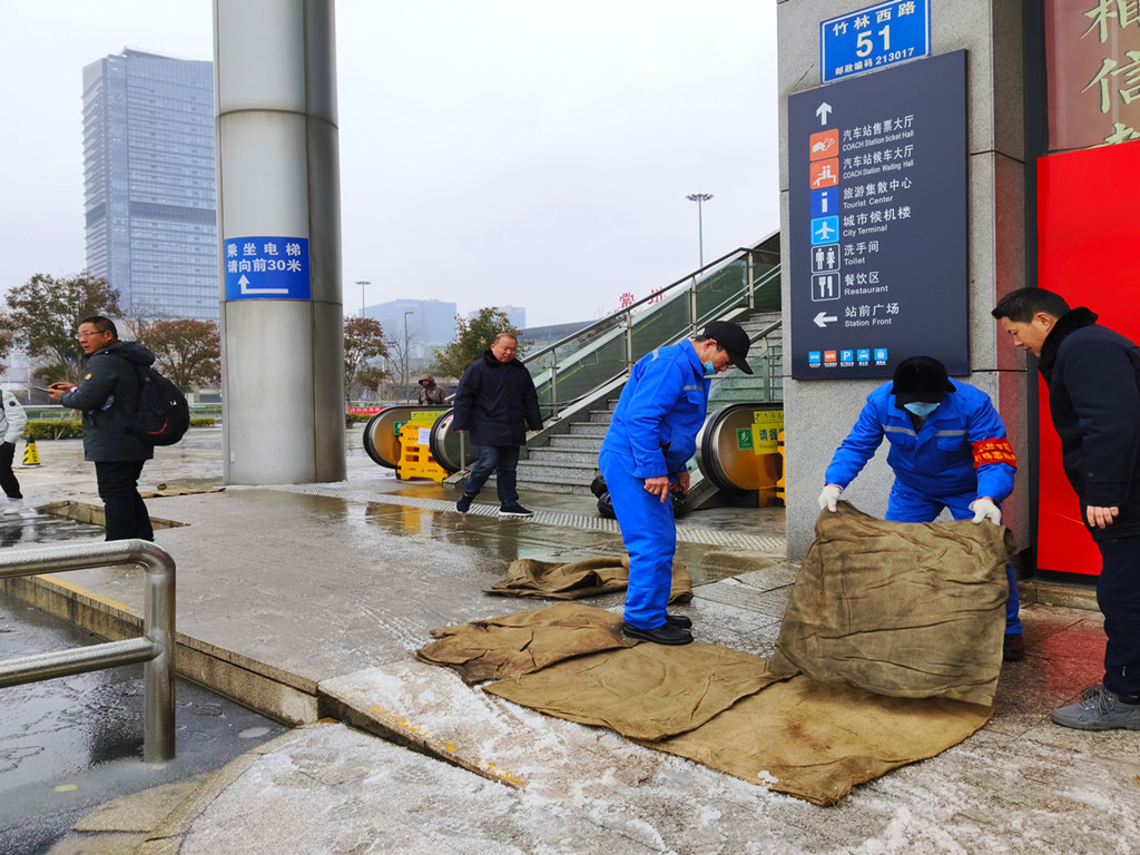 公司通過GPS動態(tài)監(jiān)控平臺掌握營運車輛在途狀況,及時提醒路況信息,要求減速慢行。為預防雪后濕滑及冰凍,常州各車站組織人員在旅客進出口處、電梯口、車輛上下坡處等重點結(jié)冰區(qū)域撒鹽并鋪設(shè)防滑麻袋,在進站候車扶梯、樓梯處做好安全提醒,全力保障旅客出行安全。23日凌晨時分,公司安管人員帶隊上路上線,查看道路情況,并根據(jù)探得的道路狀況,對班次作出了調(diào)整,確保春運期間旅客的出行安全。